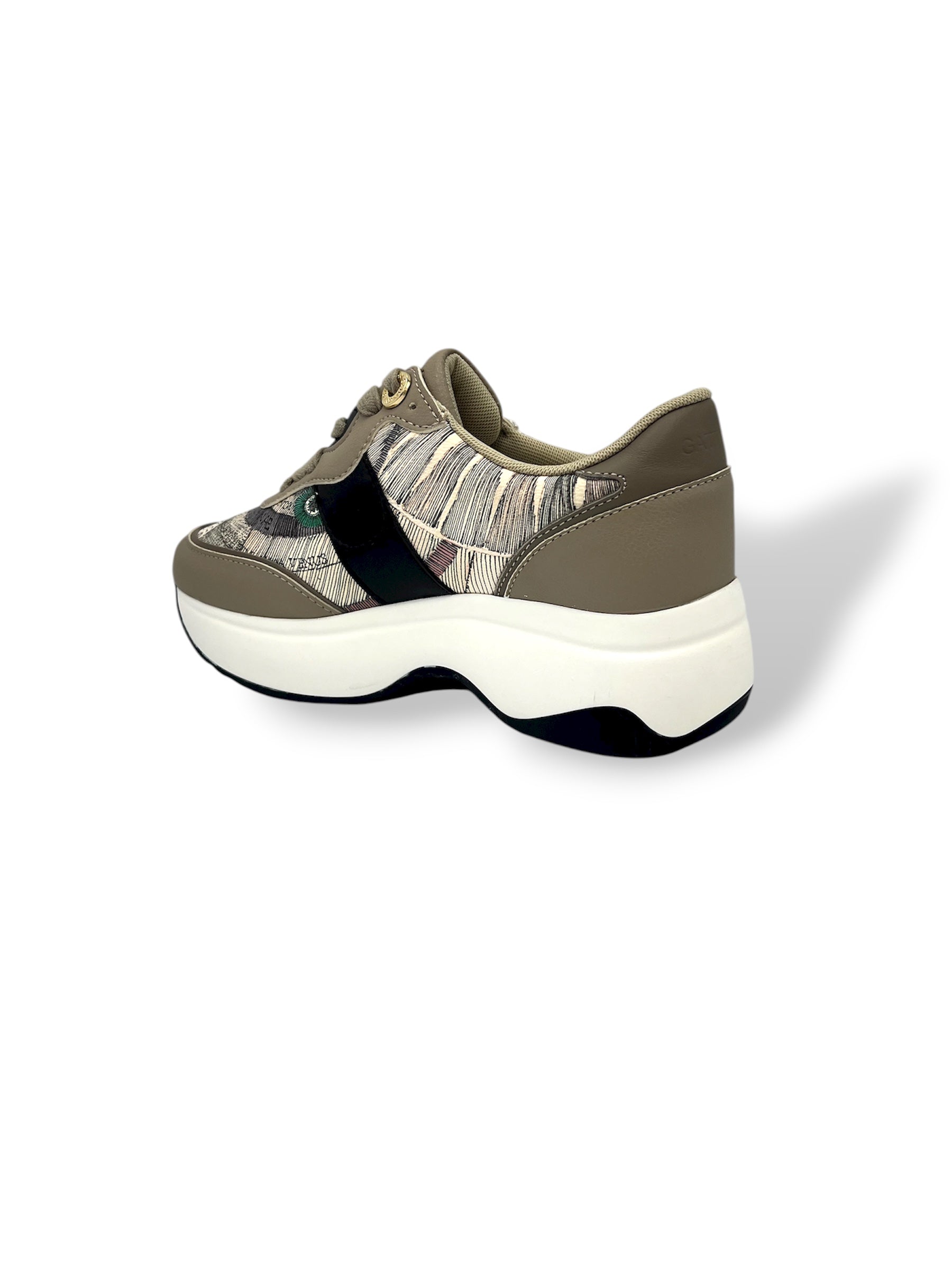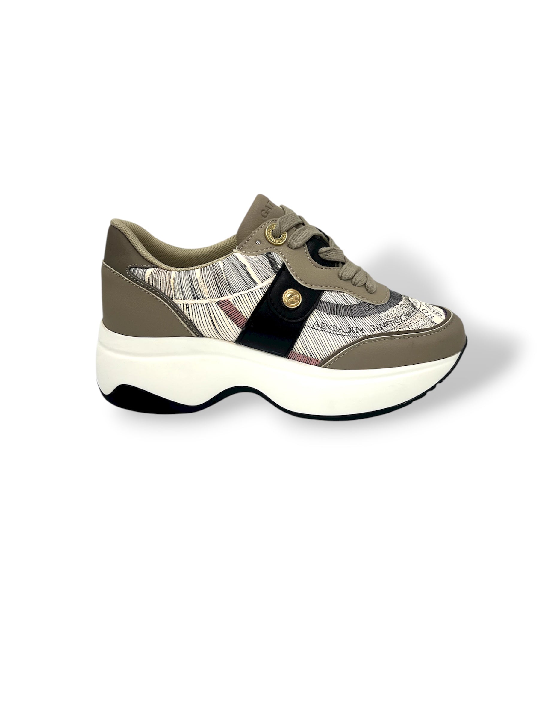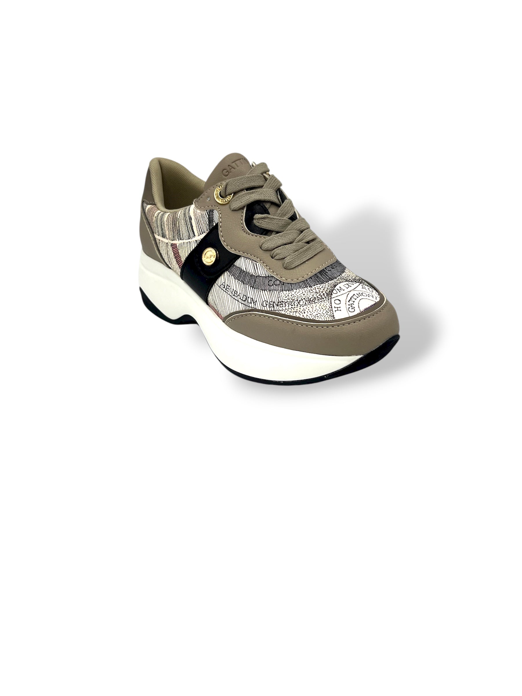 Sneakers dal design moderno e raffinato, realizzata in tessuto tecnico e pelle sintetica. La tomaia è di colore beige, arricchita da dettagli in chiaro che donano un tocco elegante e versatile. Sul lato esterno è presente il logo Gattinoni in metallo, abbinato ad un piccolo accessorio dorato sui lacci che valorizza la scarpa