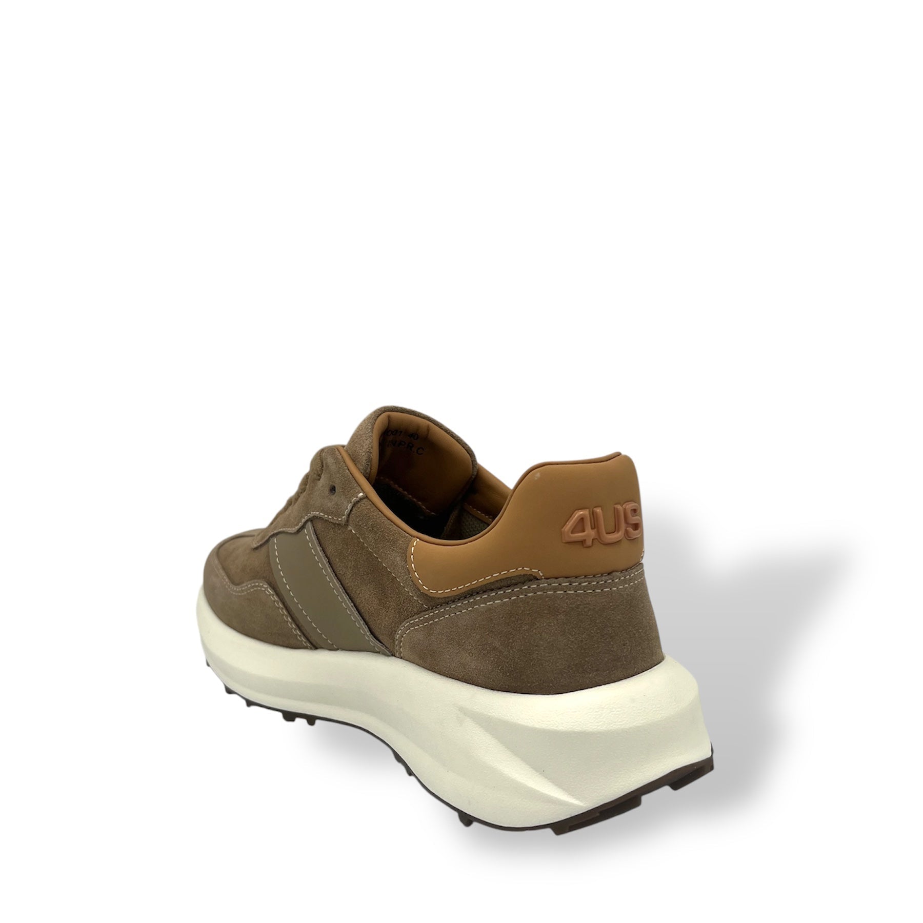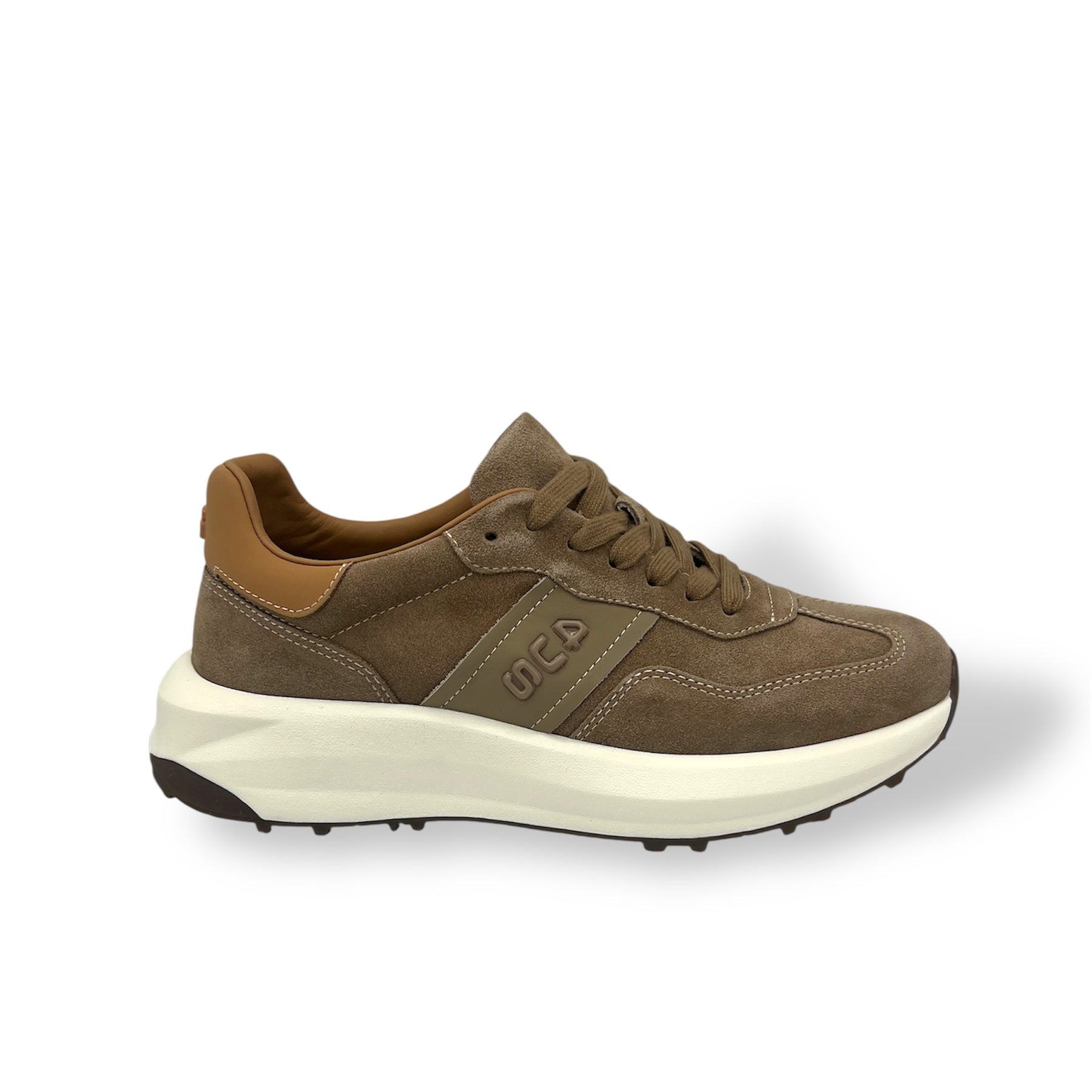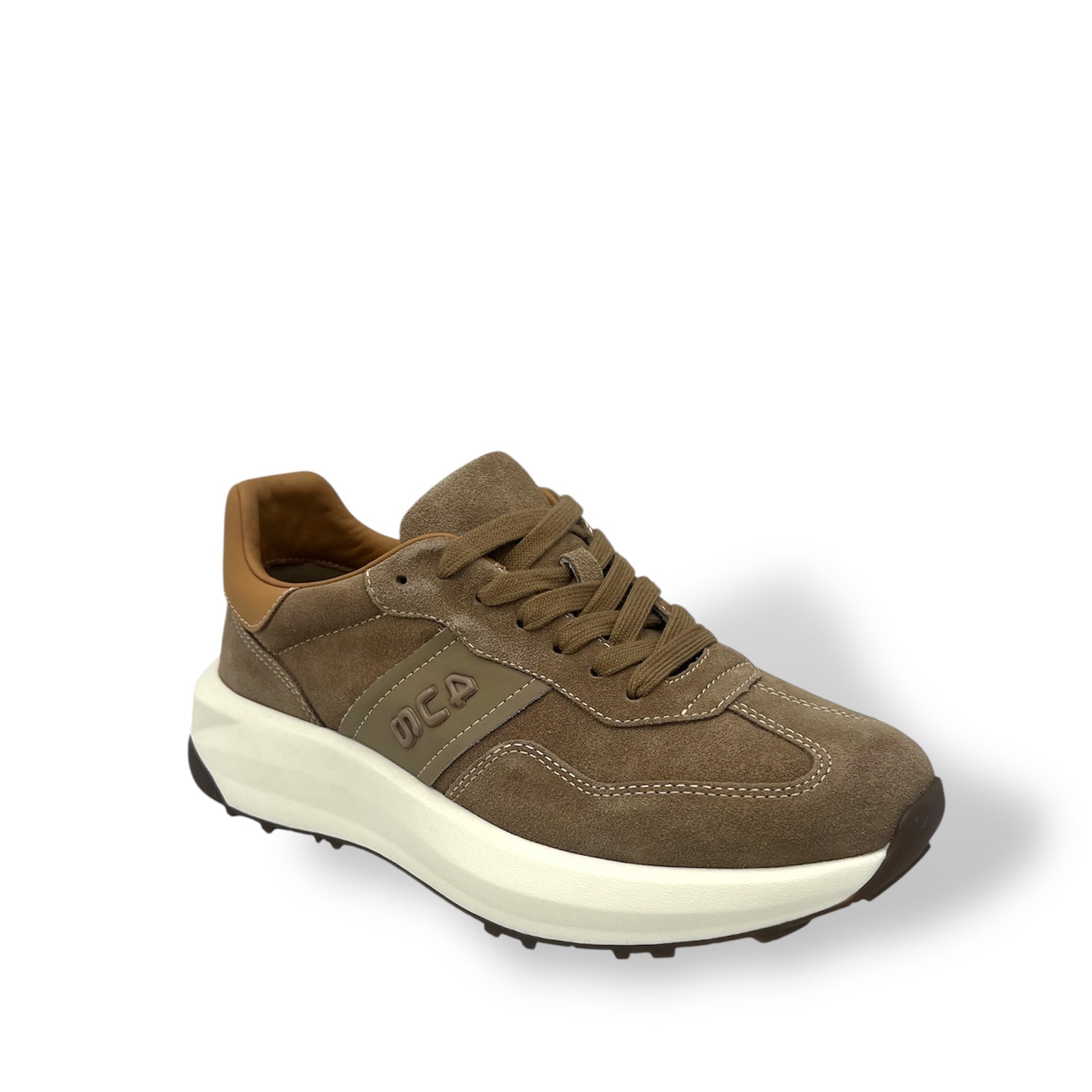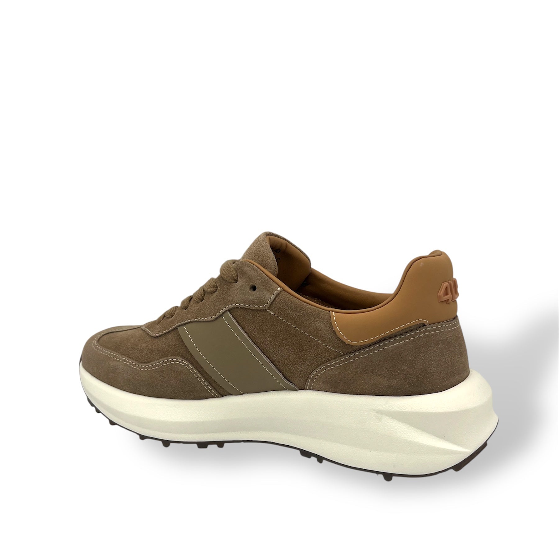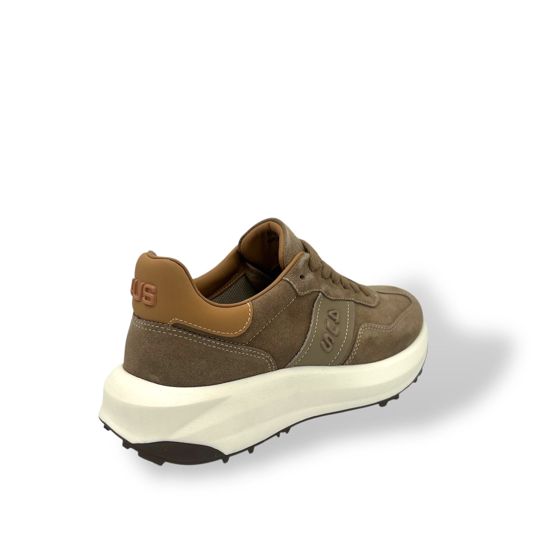 Sneaker Paciotti da uomo in pelle scamosciata e pelle liscia, caratterizzata da un design moderno e raffinato. Realizzata in tonalità marrone con dettagli a contrasto e cuciture a vista, presenta il logo laterale in rilievo. La fodera interna in pelle assicura comfort e traspirabilità, mentre la suola alta in gomma bianca dona slancio alla silhouette e garantisce stabilità e aderenza. Un modello versatile, perfetto sia per un look casual elegante che per un outfit più sportivo