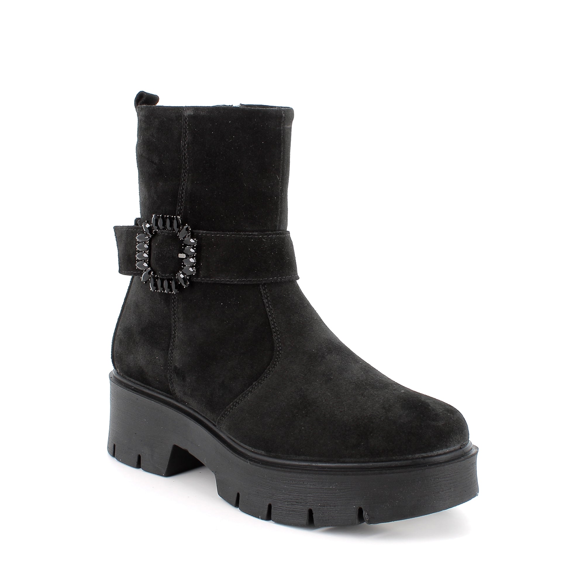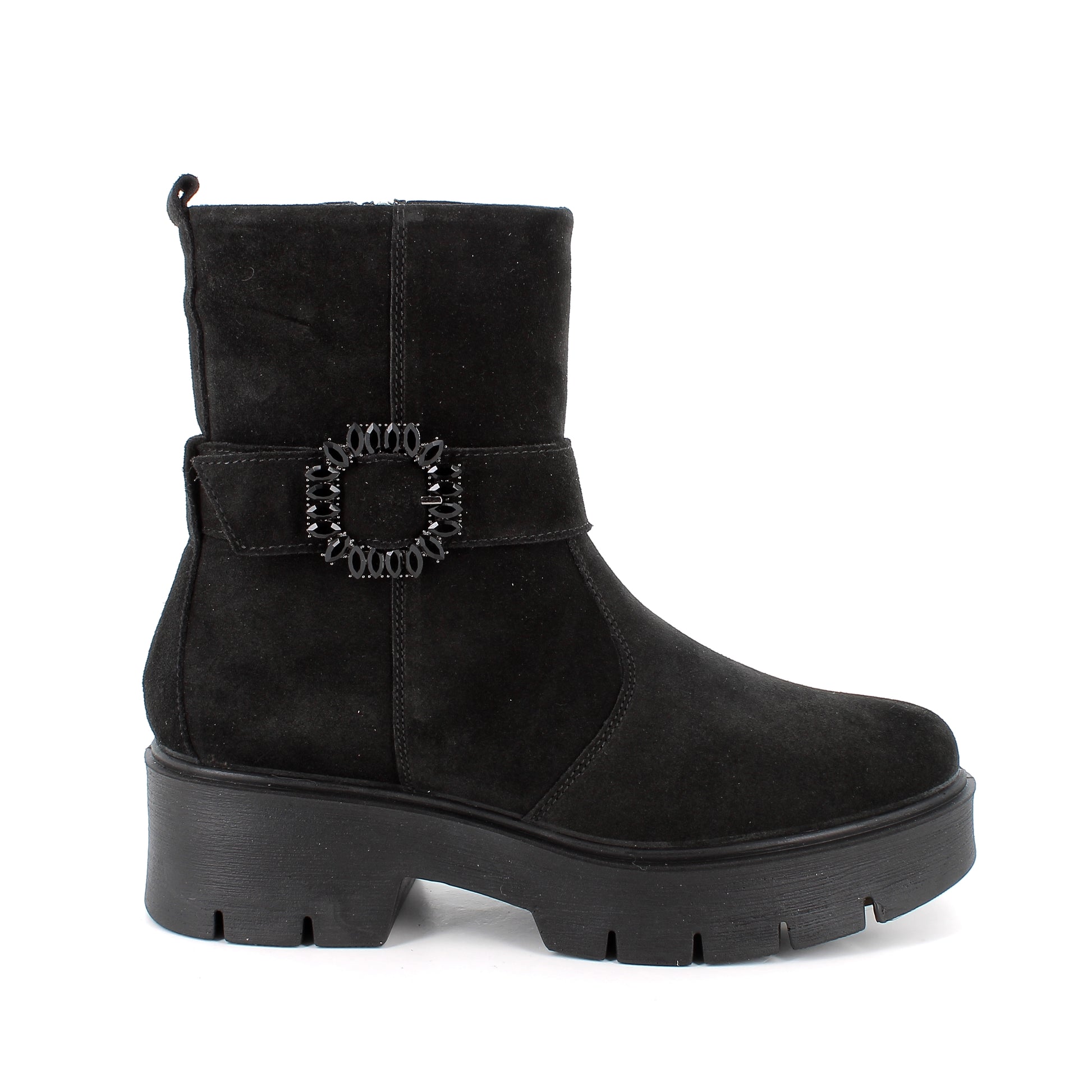 Questi stivaletti sanno come farsi notare, grazie al dettaglio gioiello sulla fascia laterale che aggiunge un tocco chic irresistibile. Ma oltre allo stile, non manca la sostanza: la suola alta e robusta ha un profilo carrarmato che garantisce grip e stabilità in ogni passo. Comodi, femminili e grintosi, sono perfetti per affrontare la stagione con un mix vincente di glamour e praticità.