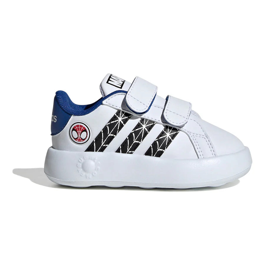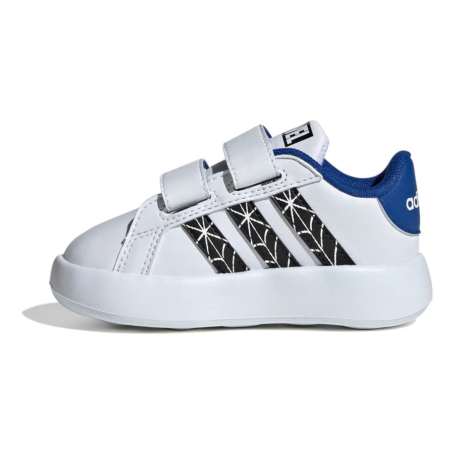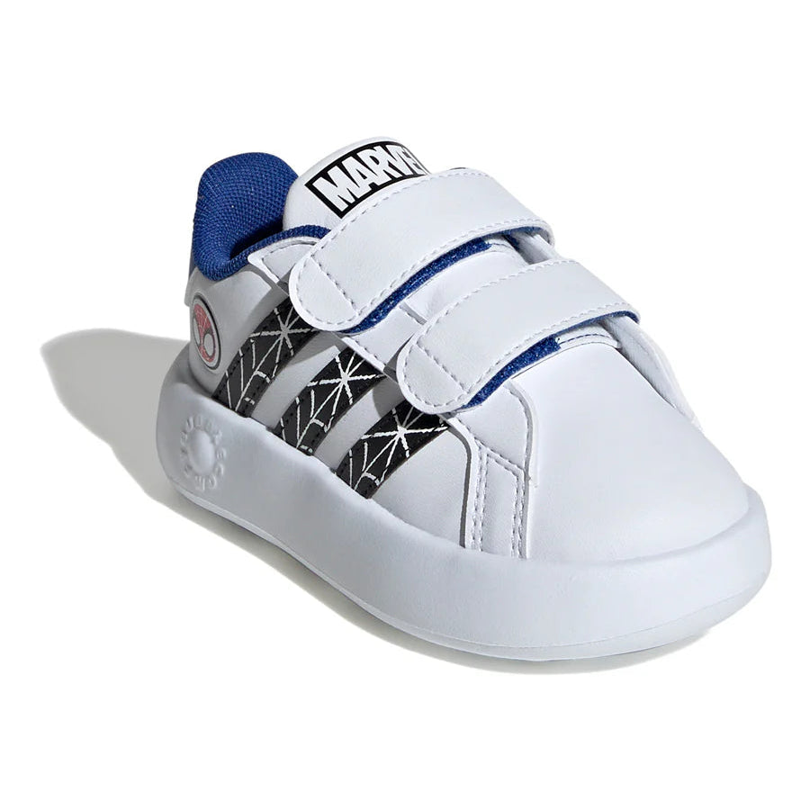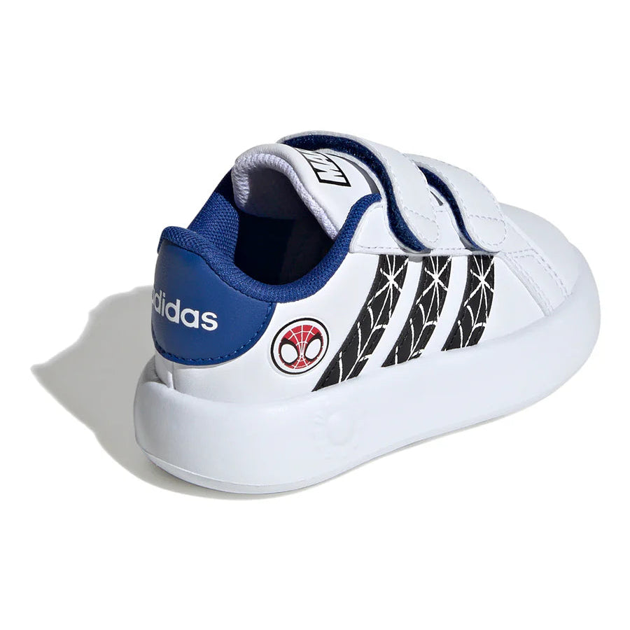 Sneakers Adidas Grand Court da bambino, dedicate a Spider-Man. Design ispirato al famoso supereroe Marvel, con dettagli accattivanti e tomaia resistente. Comode e leggere, perfette per la scuola e il tempo libero