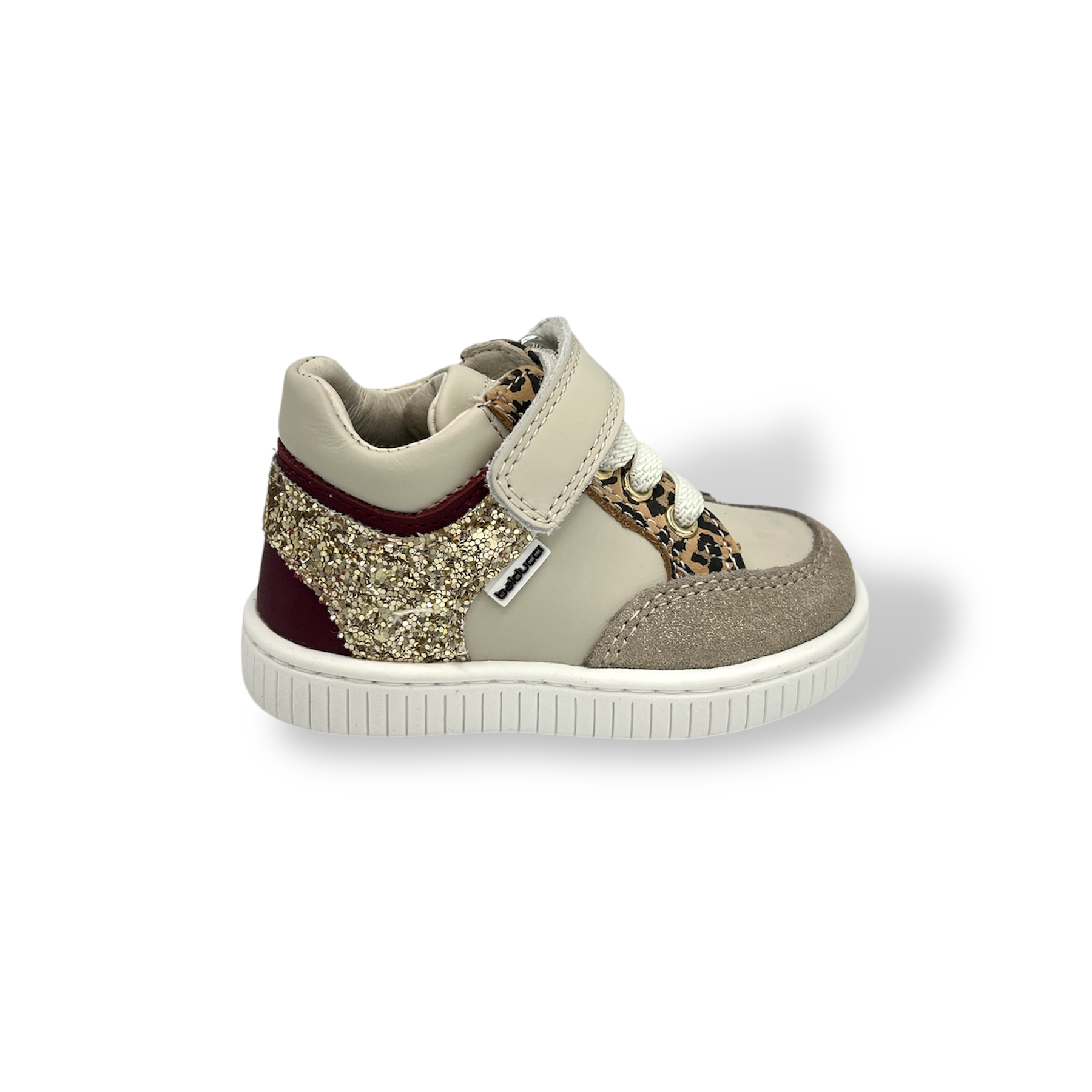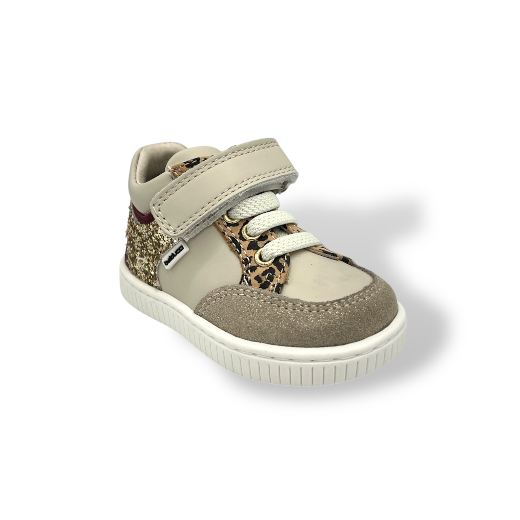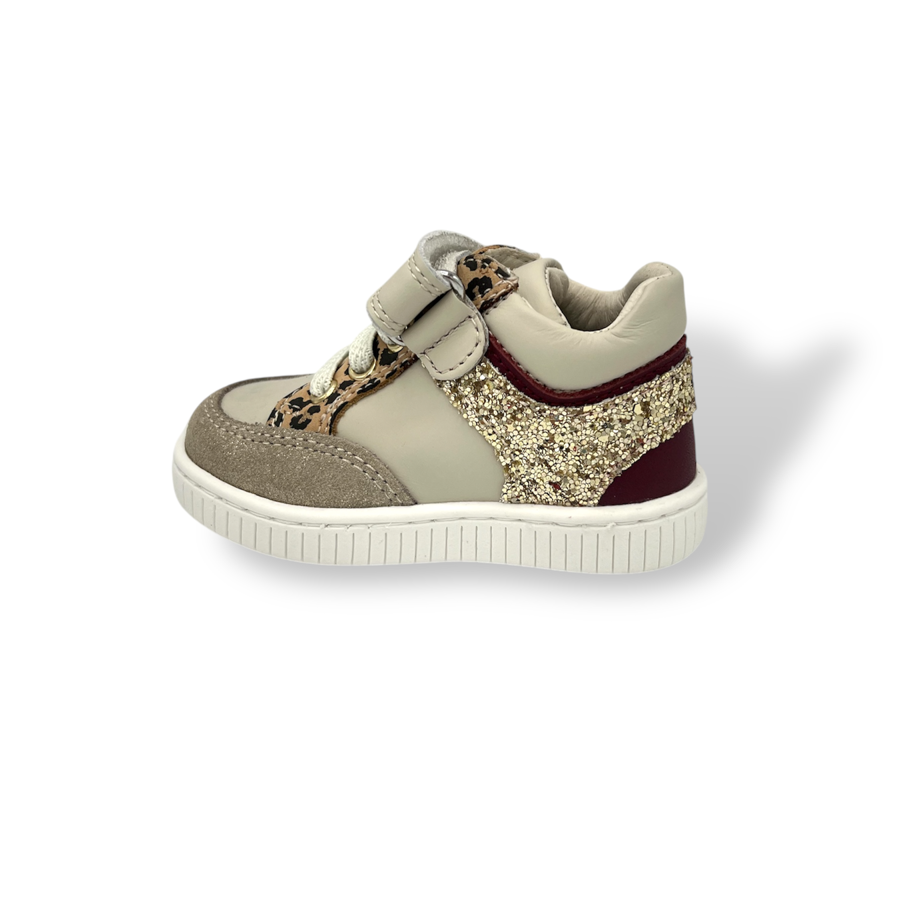 Modello alla caviglia con chiusura a strappo e lacci elastici. Realizzata in tessuto e pelle con inserti glitter oro e dettagli animalier, dona un look moderno e vivace. Fondo in gomma bianca antiscivolo, ideale per garantire comfort e stabilità durante la camminata