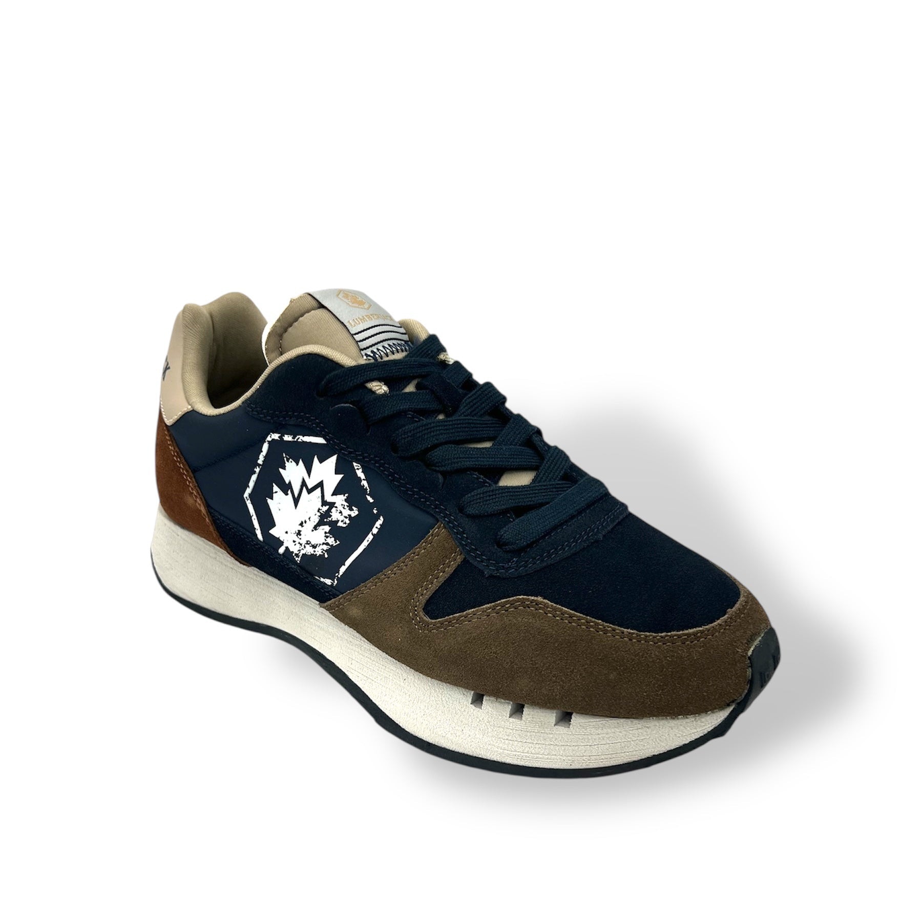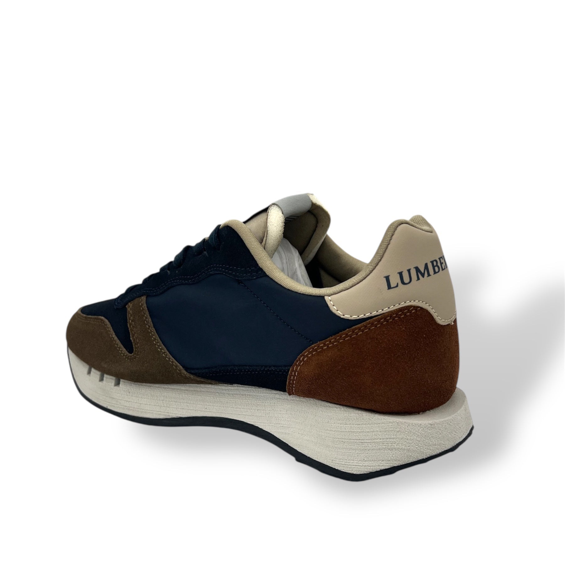 Sneaker Lumberjack da uomo in stile casual-sportivo. Realizzata in tessuto tecnico e inserti in suede marrone, con dettagli in pelle e logo laterale a contrasto. La tomaia nei toni blu navy e marrone garantisce versatilità, mentre la suola bianca in gomma con battistrada nero assicura comfort e stabilità. Ideale per l’uso quotidiano, abbinabile sia a look sportivi che casual