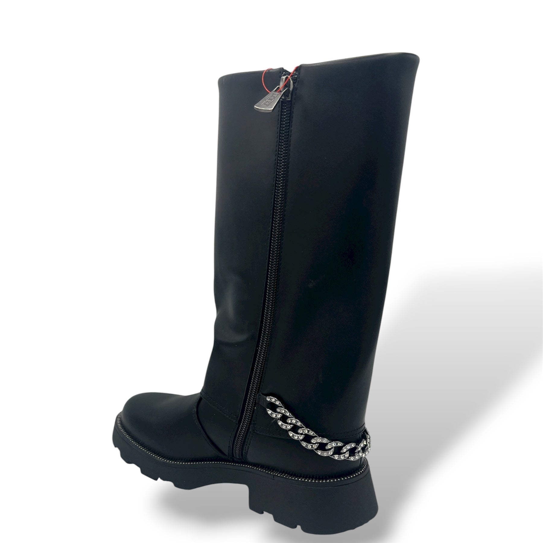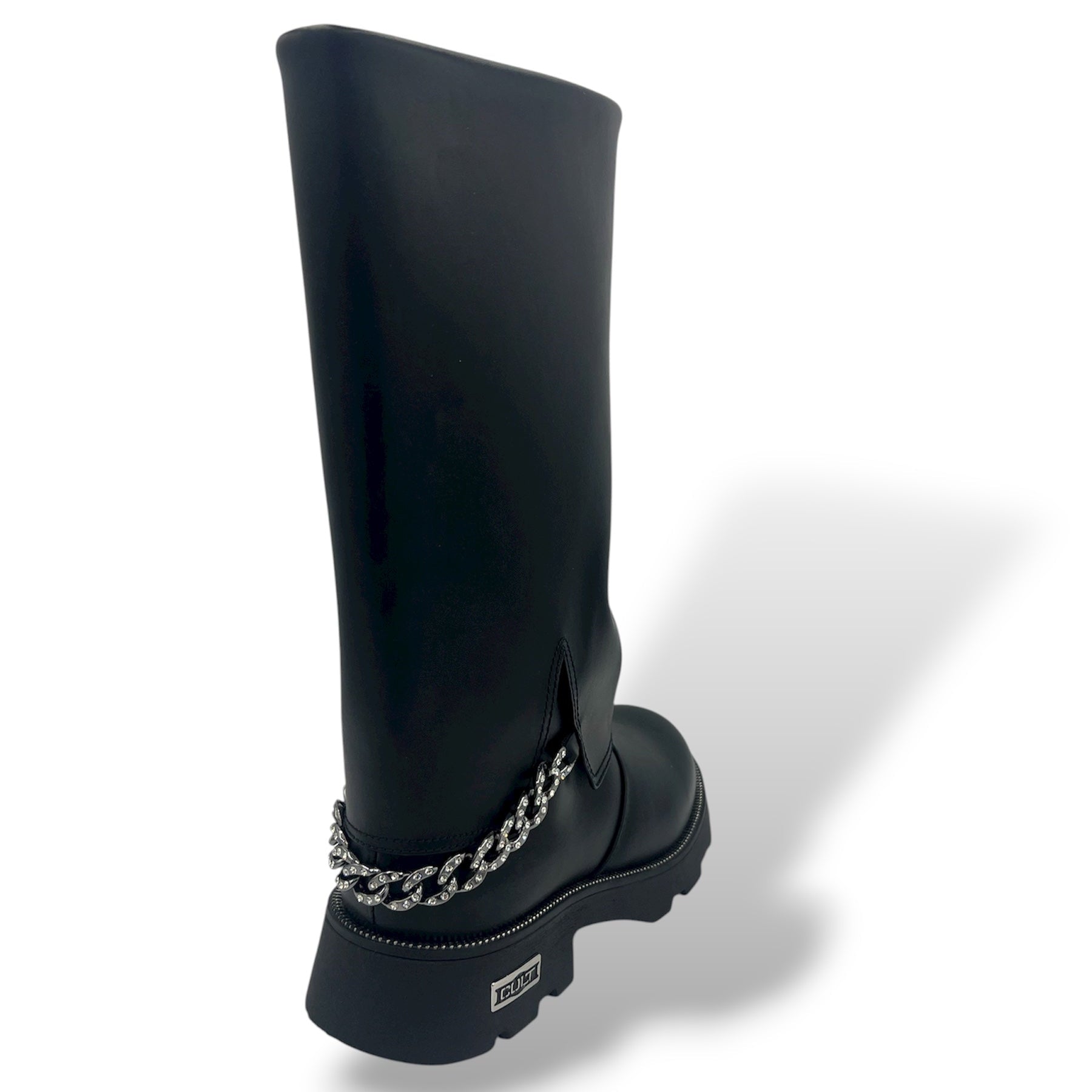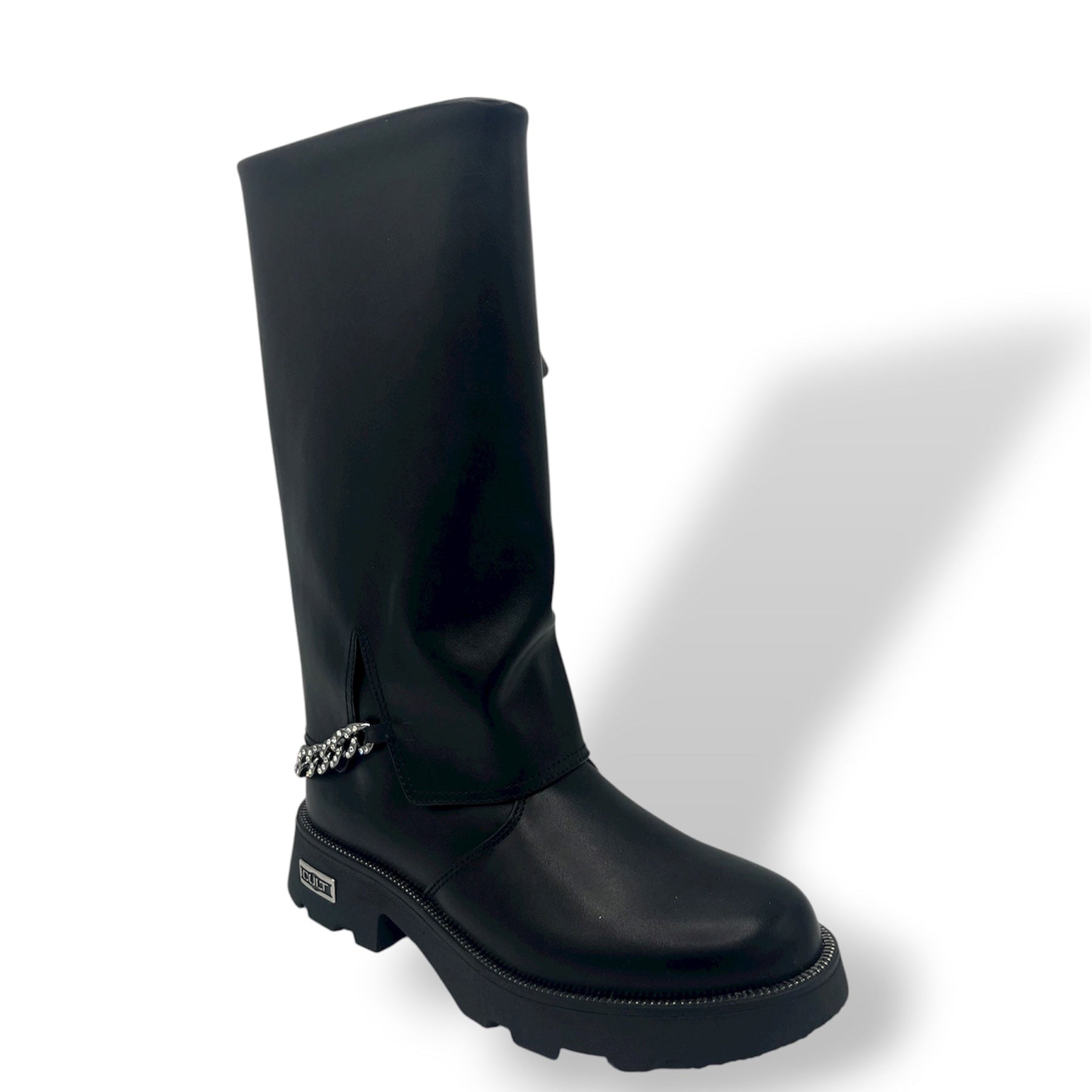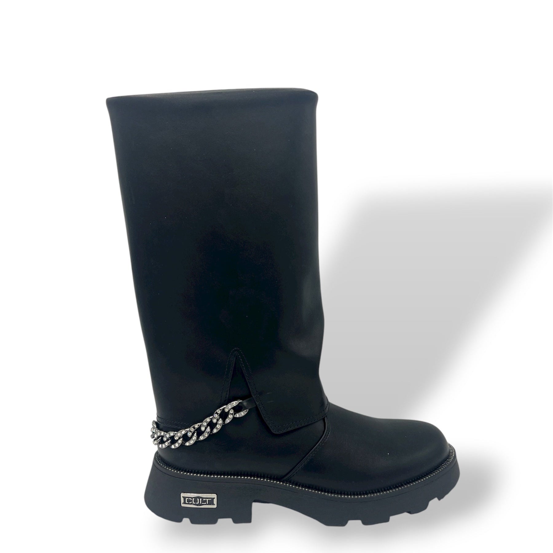 Lo stivale Cult con catena è un must-have per chi ama uno stile deciso e contemporaneo. Realizzato in ecopelle liscia di alta qualità, presenta una silhouette grintosa con punta tonda e suola carrarmato in gomma, resistente e confortevole. Il dettaglio distintivo è la catena metallica, che dona un carattere rock e ribelle, tipico del brand. La chiusura con zip laterale facilita la calzata, mentre la fodera interna garantisce comfort durante tutta la giornata.