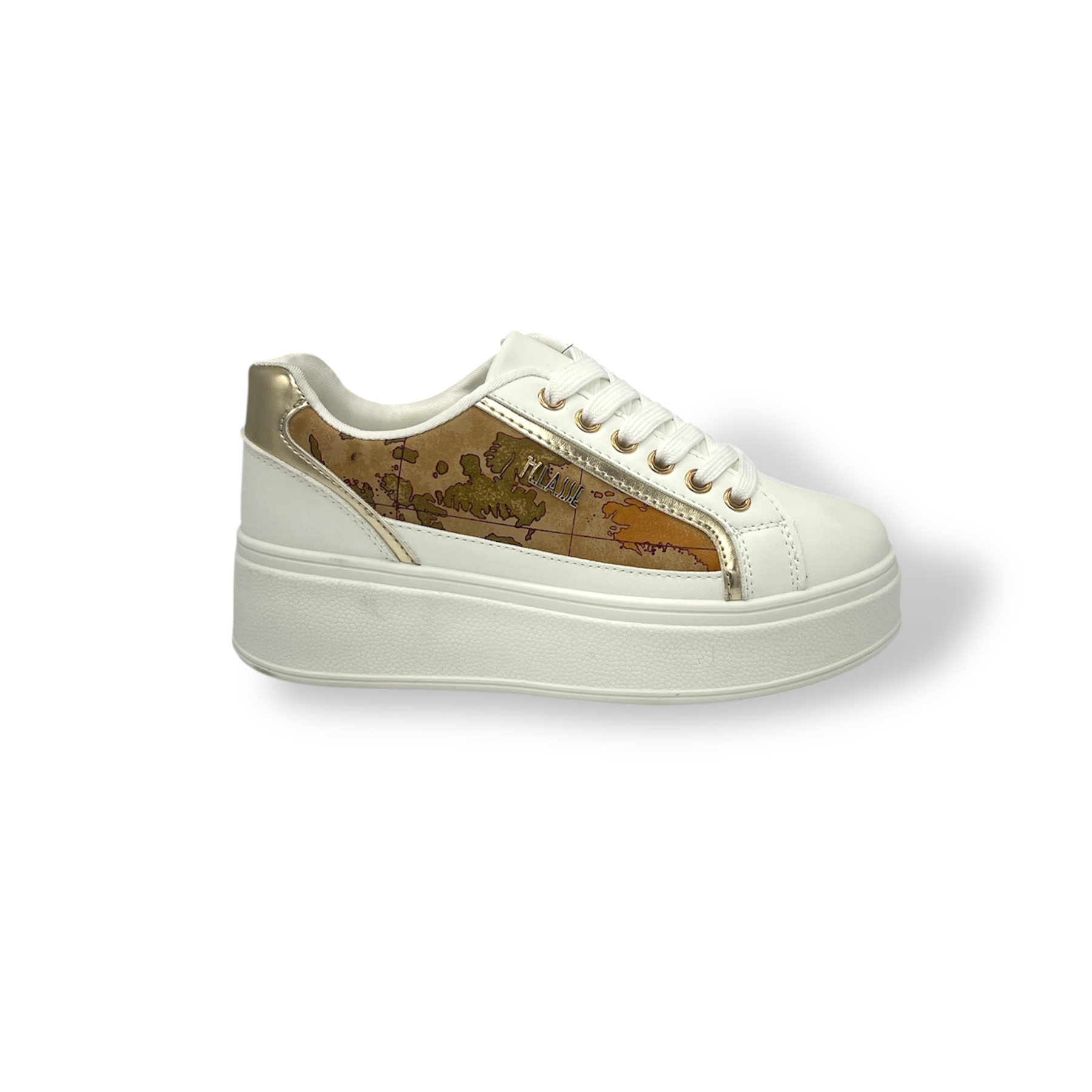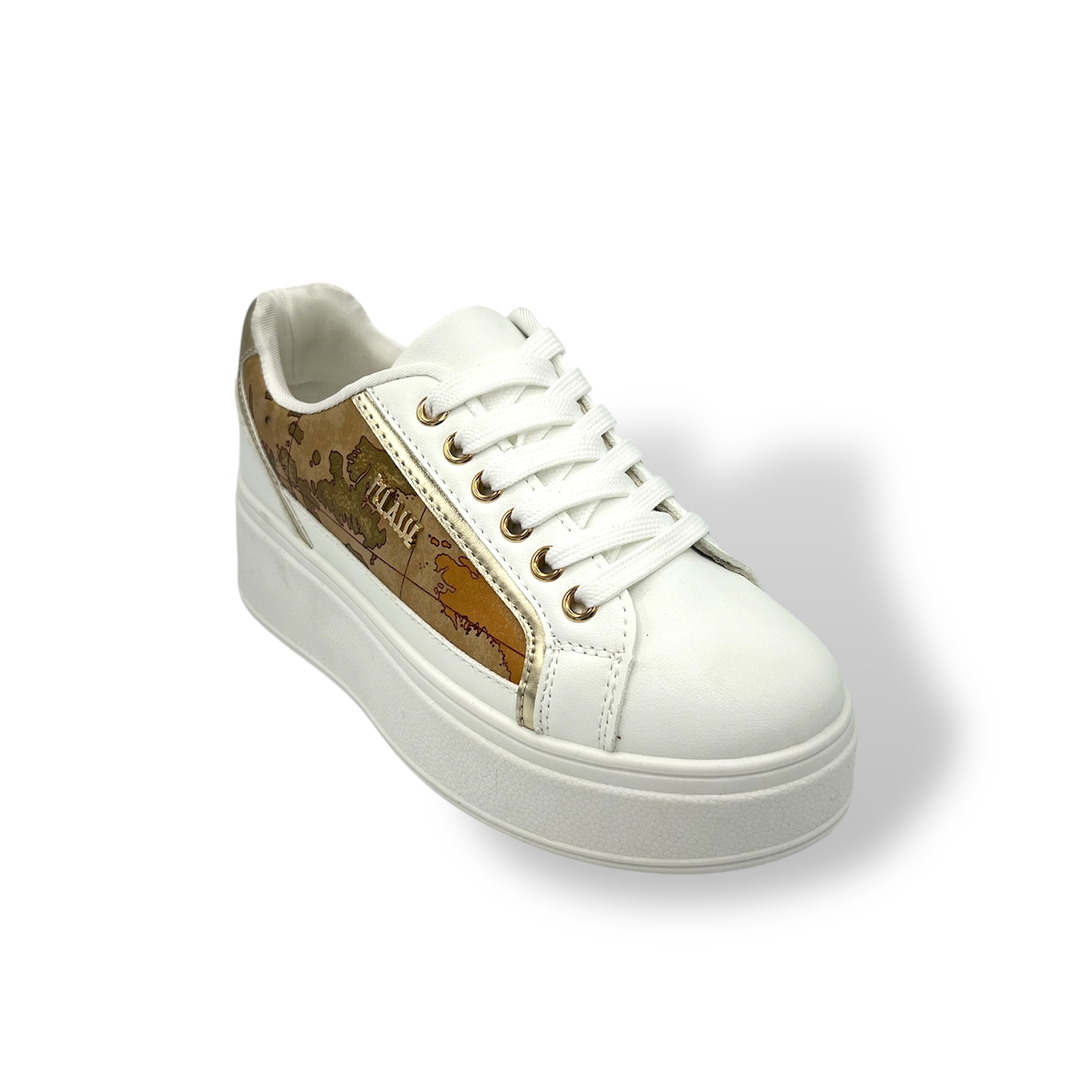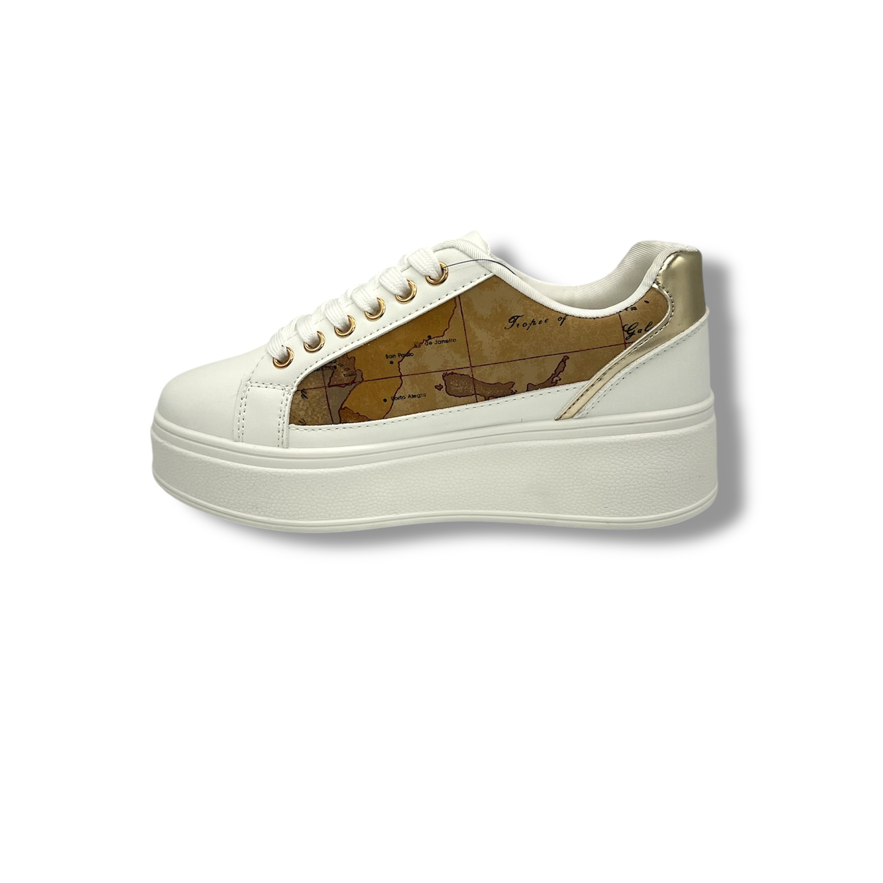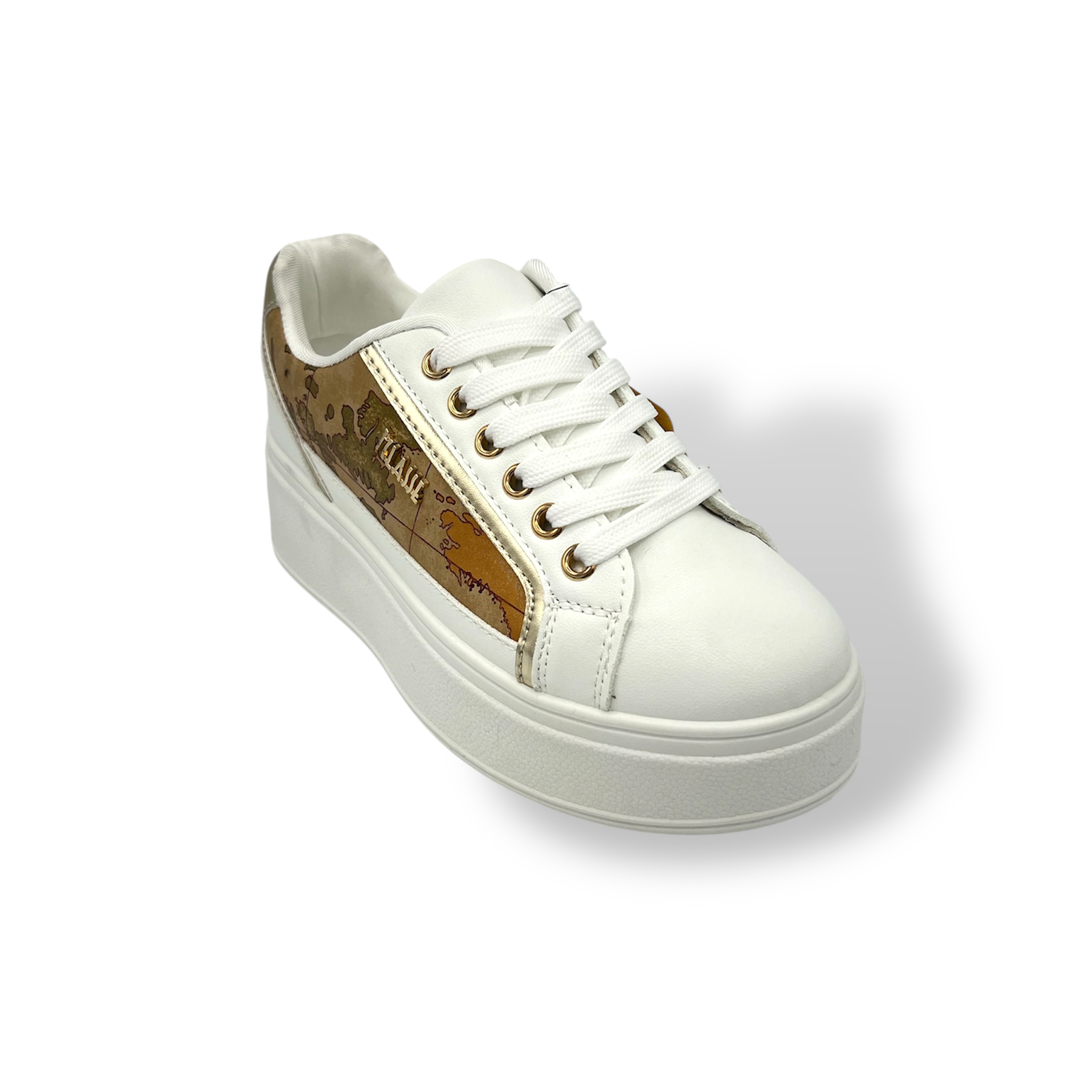 Sneakers donna in ecopelle bianca con suola platform. Dettaglio laterale con stampa mappa e inserti dorati che donano un tocco unico ed elegante. Perfette per outfit casual e alla moda, ideali da indossare tutti i giorni con stile e comfort.